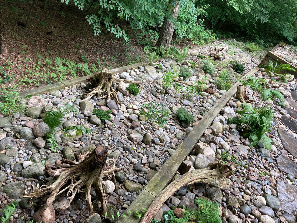 Allow me to take you on a journey through the Forest and into a magical backyard oasis! The client contacted me in hopes to improve the space, making it more aesthetically pleasing and functional. The inspiration for this project was taken from the client's passion for camping in the Bruce Peninsula and their desire for a natural stone patio with a seating area and stairs to the forest floor below. This proved to be extremely challenging both creatively and mechanically. The dense foliage and elevation changes made it impossible to use machinery. We opted to build everything by hand and cart all the materials in using wheelbarrows and sleds. The stairs were built in December using a toboggan to slide the steps down the snow-covered hill. The finished product features a flagstone patio and composite bench overlooking the forest creating a magical place to sit with friends or do yoga under the trees. The unused rock-filled retaining walls were accentuated with native woodland plants including dogwood shrubs, ferns, shade-loving evergreens, and old cedar roots to help mimic a natural forest and add visual interest. The stairs were built using a combination of 3' and 4' granite slabs to create a more natural and enchanting appearance. They take you down to the forest and back up to either the seating area or the top patio. The small triangular planter box was a challenge to fill and the final decision was to plant a columnar weeping spruce. This variety grows narrow as to not encroach on the stairs but still grows tall and fills the vertical space along the staircase. I had a lot of fun designing and building this project despite the creative and physical challenges. This was a wild and unique project and it's one that I will always cherish.