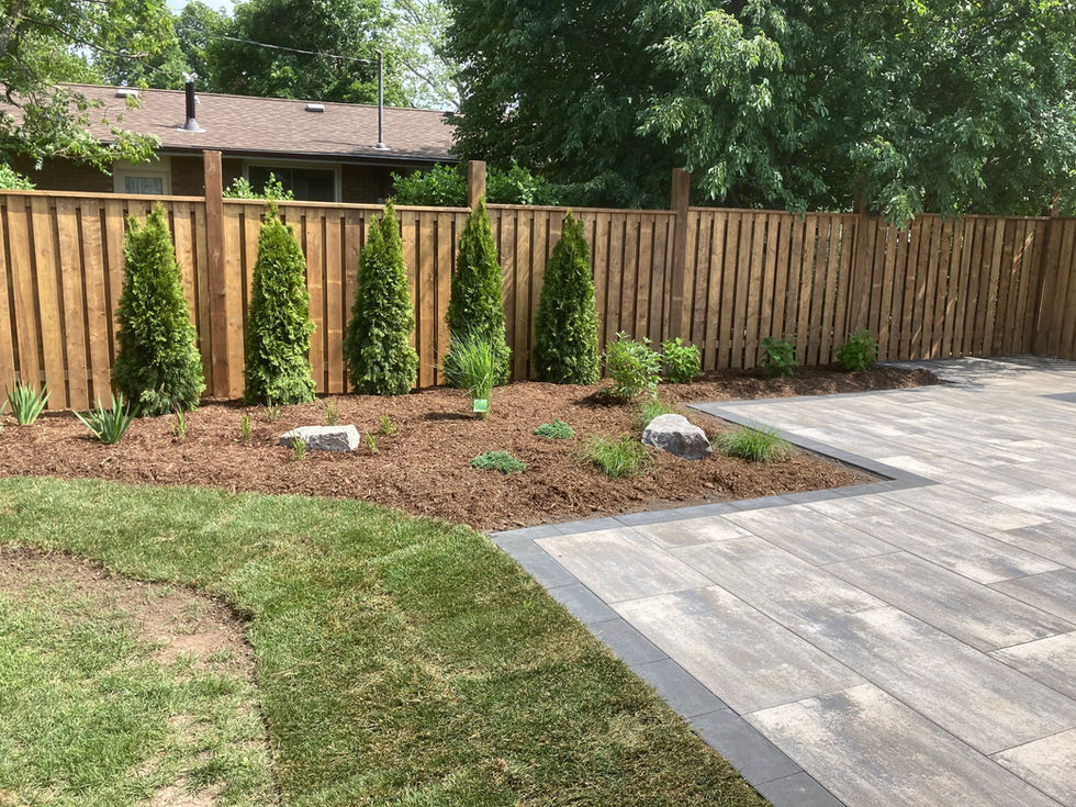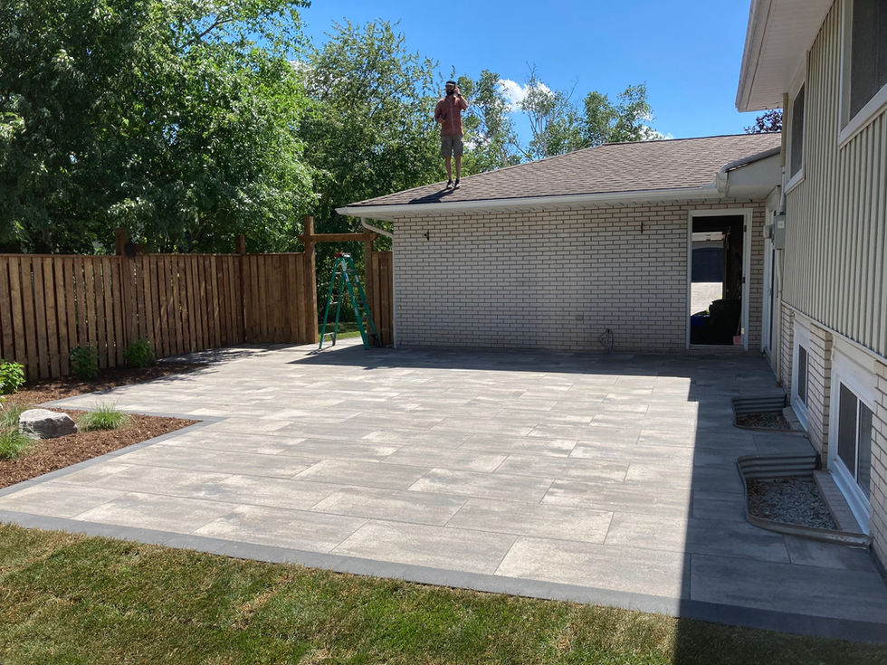 Welcome to Burlington! This project features a massive patio surrounded by gardens equipped with landscape lighting, a large shed, and a quaint deck for enjoying a morning coffee. I designed a patio with crisp lines and a modern shape to provide areas for seating and feature gardens. The client and I chose the oversized pavers to help reduce the number of visible joints in the patio and enhance the feeling of grandeur. These large pavers required the use of a 2-man hydraulic lift to place and install. The border was created to frame the patio and the charcoal colour matches the darker shades of the Melville pavers as well as the patio furniture. The gardens were simple and colorful with country influences and the addition of landscape lighting helps keep the party going well into the evening! This design blends a modern patio with a contemporary garden. The end result was an elegant outdoor living space perfect for entertaining or suntanning with a good book.